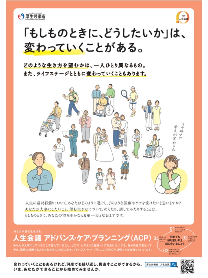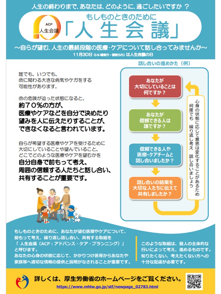 「人生会議」とは、国が推奨する「もしものときのために、あなたが望む医療やケアについて前もって考え、家族等や医療・ケアチームと繰り返し話し合い、共有する取組」のことです。