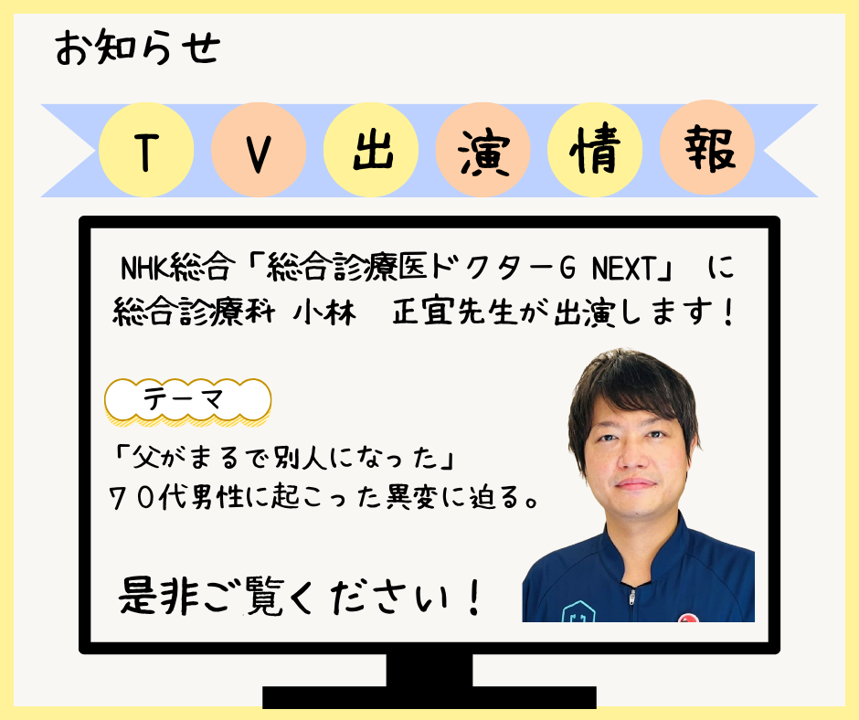 カテゴリ 当院から (51) 各診療科から (42) イベント (37) 法人から (3) 月別インデックス 2025年11月 (6) 2025年10月 (8) 2025年9月 (11) 2025年8月 (18) 2025年7月 (8) 2025年6月 (7) 2025年5月 (7) 2025年4月 (9) 2025年3月 (3) 2025年2月 (3) 2025年1月 (12) 2024年12月 (3) 2024年11月 (3) 2024年10月 (4) 2024年9月 (2) 2024年8月 (3) 2024年7月 (3) 2024年6月 (4) 2024年5月 (2) 2024年4月 (5) 2024年3月 (2) 2024年2月 (3) 2024年1月 (5) 【テレビ出演のお知らせ】総合診療科特任医長 小林 正宜先生がNHKの番組に出演します 2025.11.13 当院から 総合診療科特任医長、葛西医院院長 小林 正宜先生がNHK総合 「総合診療医ドクターG NEXT」に出演されます。 是非ご覧ください。 日時 11月14日(金)22:00~22:45 番組名 NHK総合「総合診療医ドクターG NEXT」 番組概要 実際の症例を描く再現ドラマから、総合診療医「ドクターG」のリードで研修医とゲストが病名を推理。 今回は「父がまるで別人になった」。70代男性に起こった異変に迫る。 番組サイトはこちら 一覧へ戻る