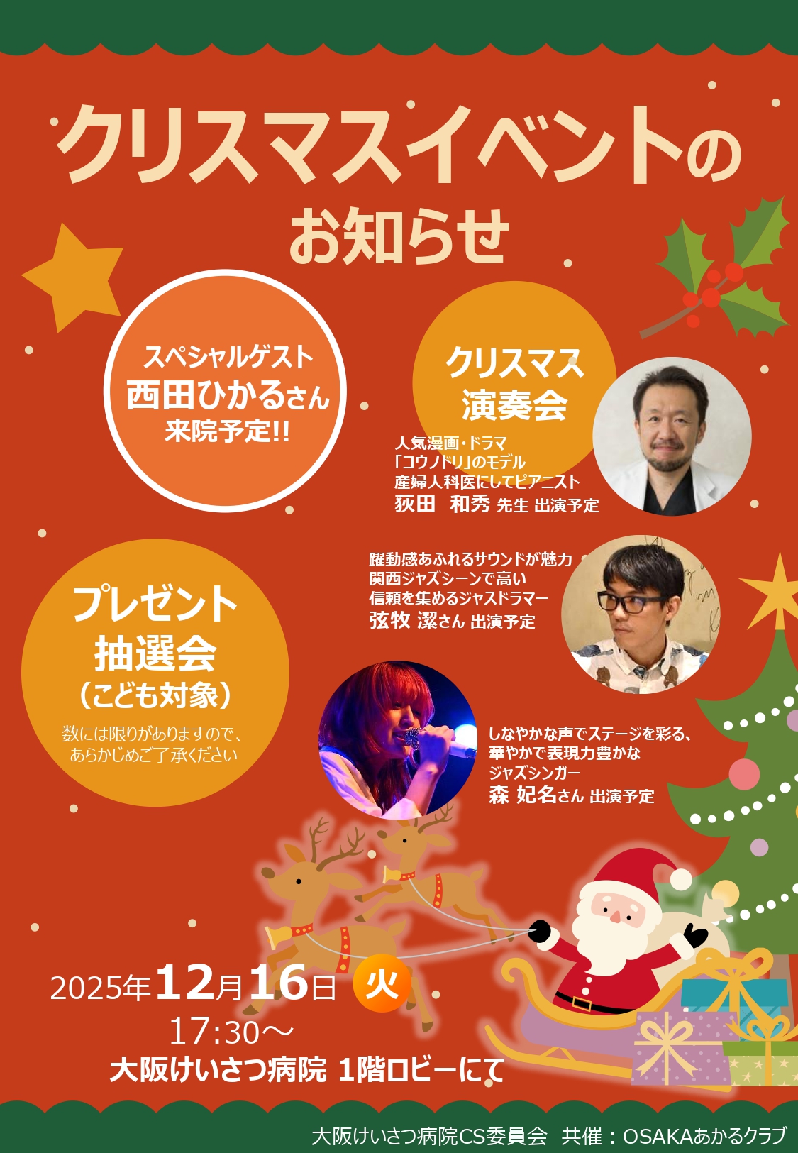 2025年12月16日(火)、当院主催、OSAKAあかるクラブ共催のクリスマスコンサートを開催します。