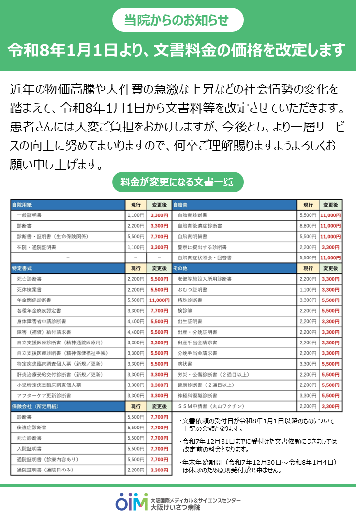 カテゴリ 当院から (56) 各診療科から (47) イベント (39) 法人から (7) 月別インデックス 2025年12月 (12) 2025年11月 (14) 2025年10月 (6) 2025年9月 (11) 2025年8月 (17) 2025年7月 (8) 2025年6月 (7) 2025年5月 (7) 2025年4月 (9) 2025年3月 (3) 2025年2月 (3) 2025年1月 (12) 2024年12月 (3) 2024年11月 (2) 2024年10月 (4) 2024年9月 (2) 2024年8月 (3) 2024年7月 (3) 2024年6月 (4) 2024年5月 (2) 2024年4月 (5) 2024年3月 (2) 2024年2月 (3) 2024年1月 (5) 文書料改定のお知らせ 2025.12.16 当院から 近年の物価高騰や人件費の急激な上昇などの社会情勢の変化を踏まえて、令和8年1月1日から文書料等を改定させていただきます。 患者様には大変ご負担をおかけしますが、今後とも、より一層サービスの向上に努めてまいりますので、何卒ご理解賜りますようよろしくお願い申し上げます。 ※2025 年12月31日までに受付けた文書依頼につきましては改定前の料金となります。 ※年末年始期間(2025年12月30日~2026年1月4日)は休診のため原則受付が出来ません。 一覧へ戻る