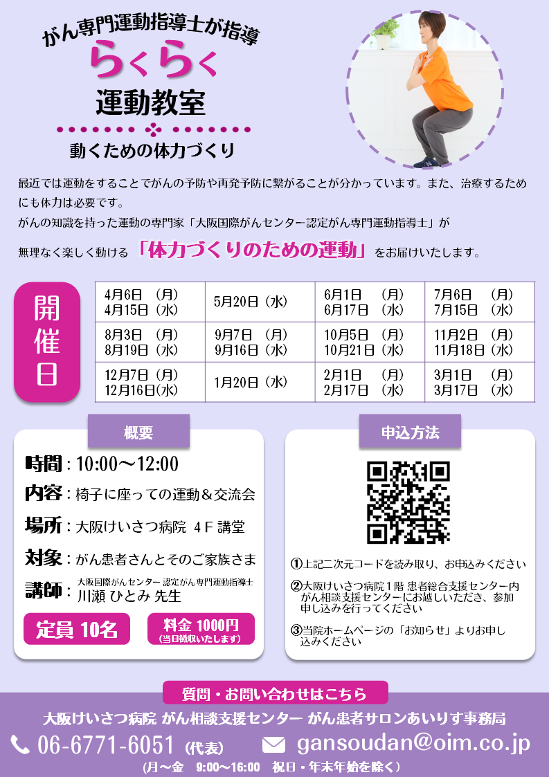 | お問い合わせ | 大阪けいさつ病院 がん相談支援センター がん患者サロンあいりす事務局 電話番号:06-6771-6051(代表) (受付時間:月~金 9:00~16:00 祝日・年末年始を除く) |