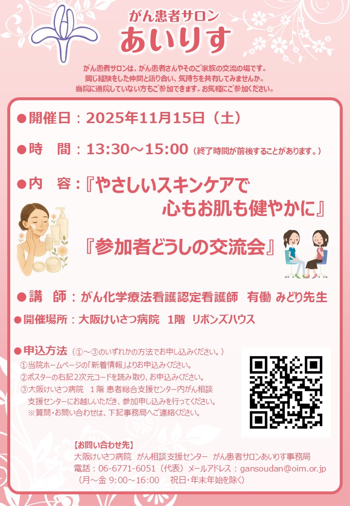 2025年11月15日(土)に、がん患者サロン「あいりす」を開催します。