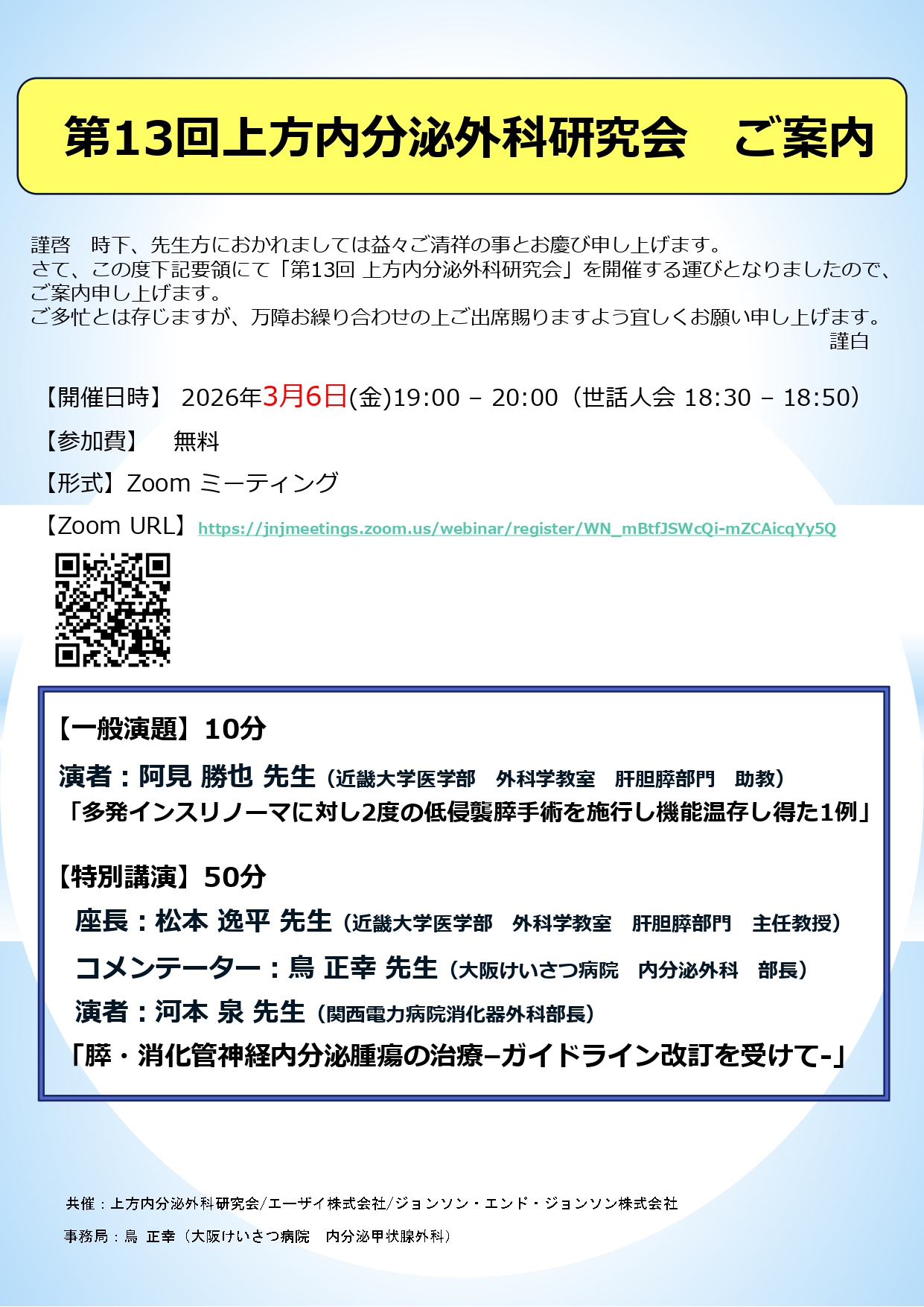| 共 催 | 上方内分泌外科研究会・エーザイ株式会社・ジョンソン・エンド・ジョンソン株式会社 |