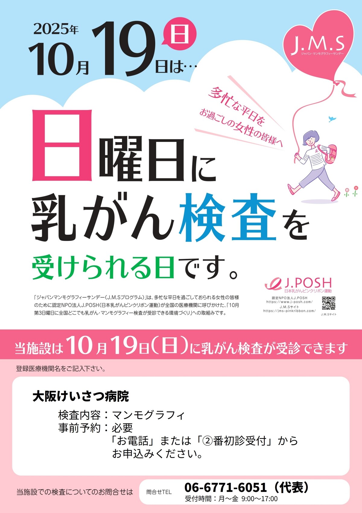J.M.Sは子育て・介護・仕事・家事などで忙しく、平日に検診を受けに行きにくい女性が、休日の日曜日に「乳がん検診」を受けられるよう、全国の医療機関と認定NPO法人J.POSHが協力して毎年10月第3日曜日に乳がん検診マンモグラフィー検査を受診できる環境づくりへの取り組みです。