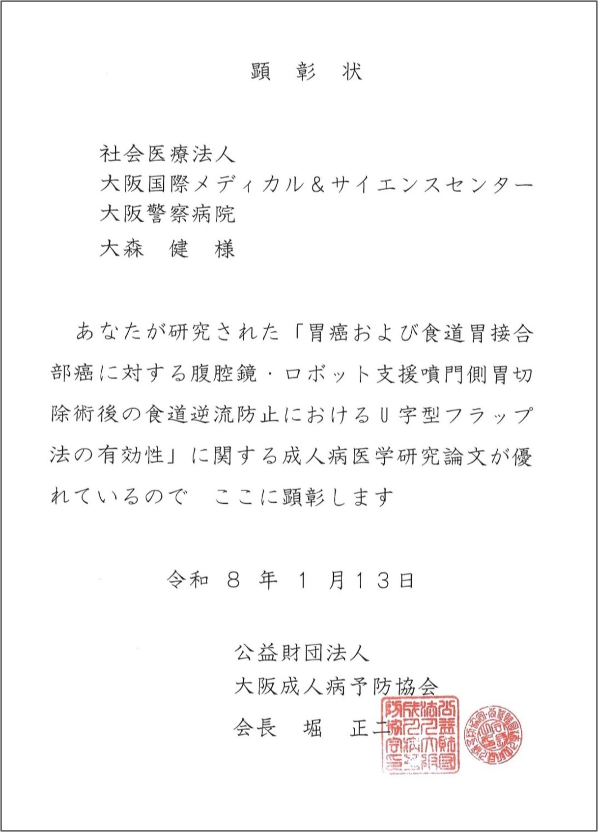 当院 消化器外科 主任部長 大森 健 医師の研究論文が、公益財団法人 大阪成人病予防協会より顕彰されました。