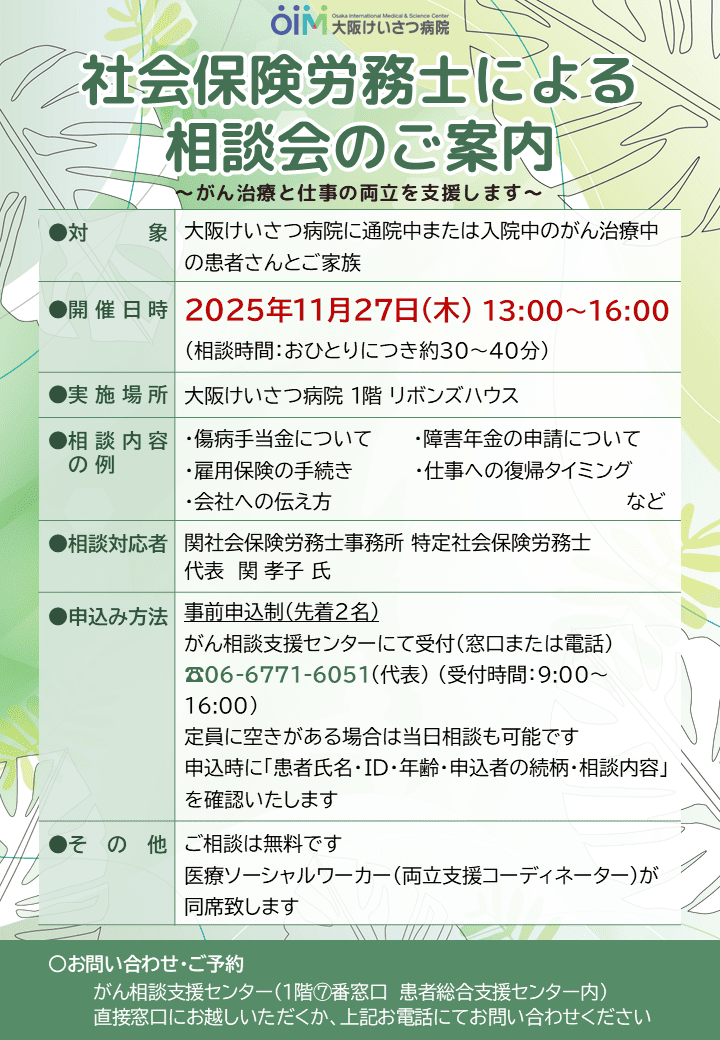 2025年11月27日(木) に、当院通院中または入院中のがん治療中の患者さんとご家族を対象とした、社会保険労務士による相談会を開催いたします。