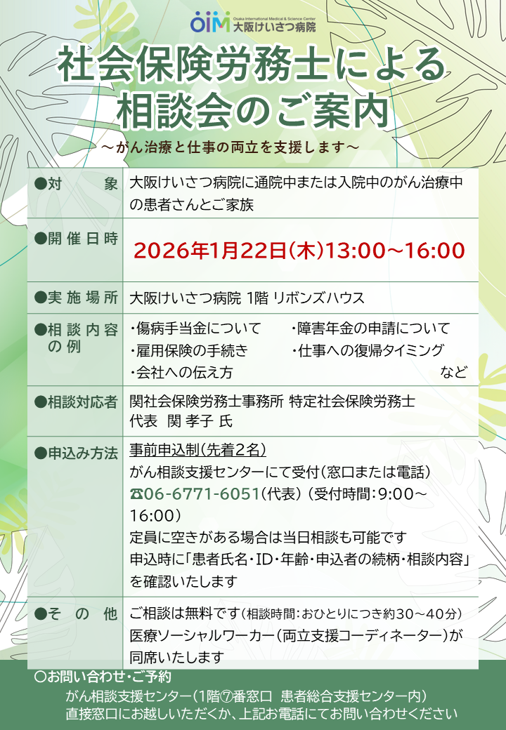 2026年1月22日(木) に、当院通院中または入院中のがん治療中の患者さんとご家族を対象とした、社会保険労務士による相談会を開催いたします。