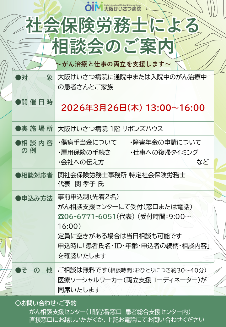 2026年3月26日(木) に、当院通院中または入院中のがん治療中の患者さんとご家族を対象とした、社会保険労務士による相談会を開催いたします。