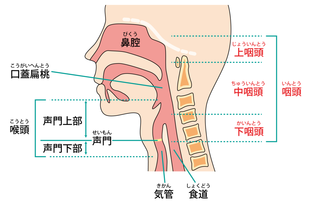 咽頭は、鼻の奥から食道まで続く、空気や食べ物の通り道で、「のど」の一部です。呼吸や食べ物を飲み込むといった、命に関わる大切な働きをしています。