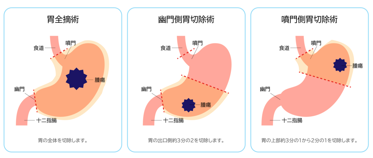 - 胃全摘術:胃をすべて切除する手術