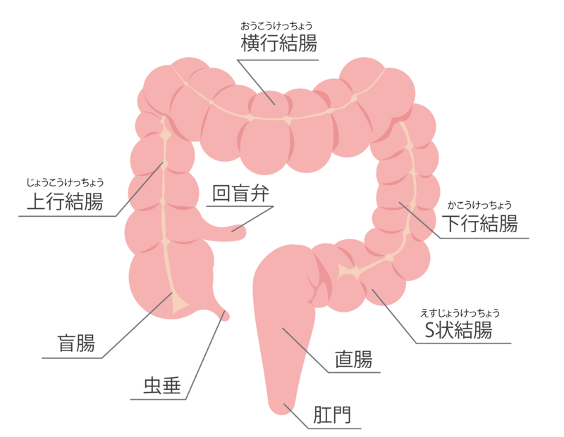 大腸は消化管の最終部にある臓器で、結腸と直腸に分かれています。長さは約1.5〜2mあり、小腸から送られてきた内容物の水分を吸収し、便を形成・排出する役割を担っています。
