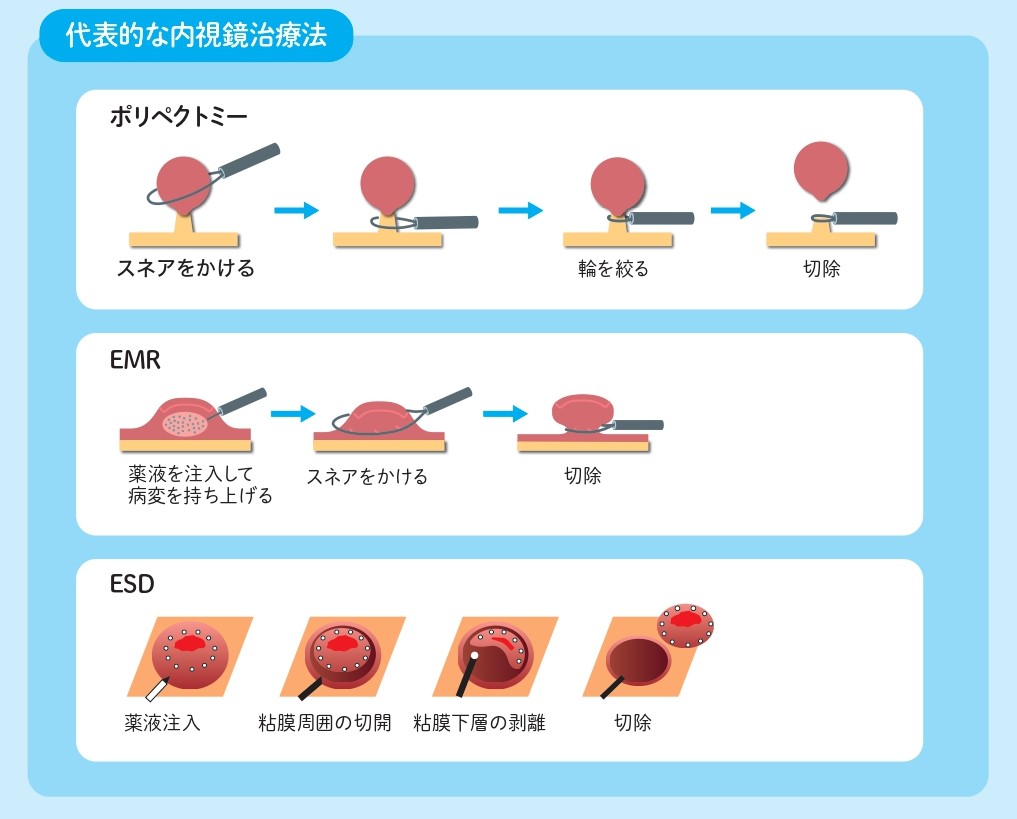 内視鏡的切除術の適応となる大腸のがん・腺腫に対する内視鏡切除方法は病変の形態や大きさによって使い分けています。代表的な方法は下記のとおりです。