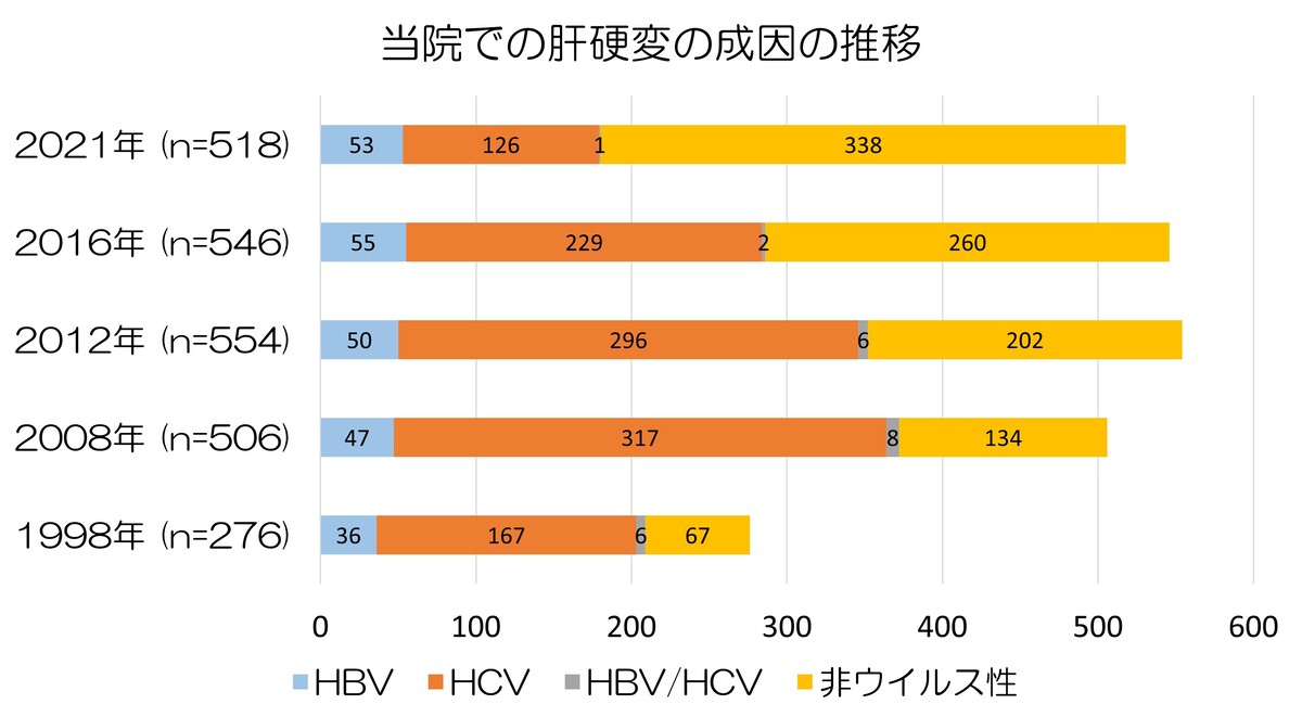 最近ではウイルスが原因の肝硬変は減少傾向ですが、脂肪性肝炎を代表とする、生活習慣や代謝の問題が原因となる「代謝性機能障害関連脂肪性肝疾患(MASLD)」が増加傾向にあります。そのため、肝硬変の患者さんの総数は少し減った程度です。