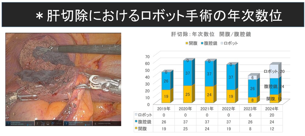肝切除は、肝臓にできたがんを外科的に取り除く治療法です。がんの位置や大きさ、肝臓の機能などを総合的に判断して行われます。当院では、体への負担が少ない腹腔鏡・ロボット支援下手術を積極的に導入しており、肝切除の約80%以上を腹腔鏡・ロボット支援下手術で実施しています。