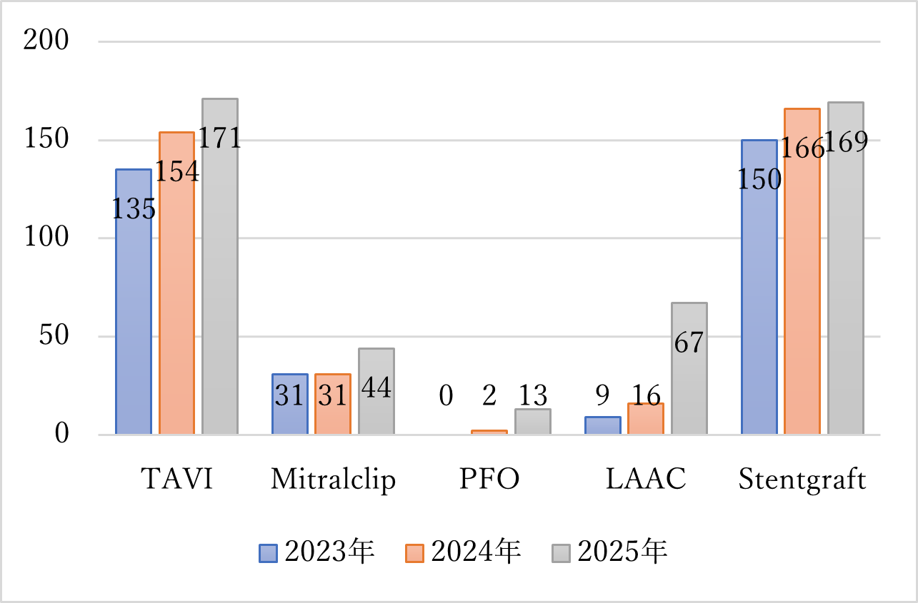 当院では、経カテーテル大動脈弁植込み術(TAVI)をはじめ、経皮的僧帽弁接合不全修復術(MitraClip)、卵円孔開存閉鎖術、左心耳閉鎖術(LAAC)など多様なSHD治療を積極的に行っており、全国有数の症例数を誇ります。